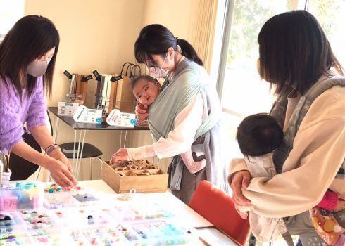 ワークショップでは、シリコンビーズや数種類のパーツの中から好きな物を選んで