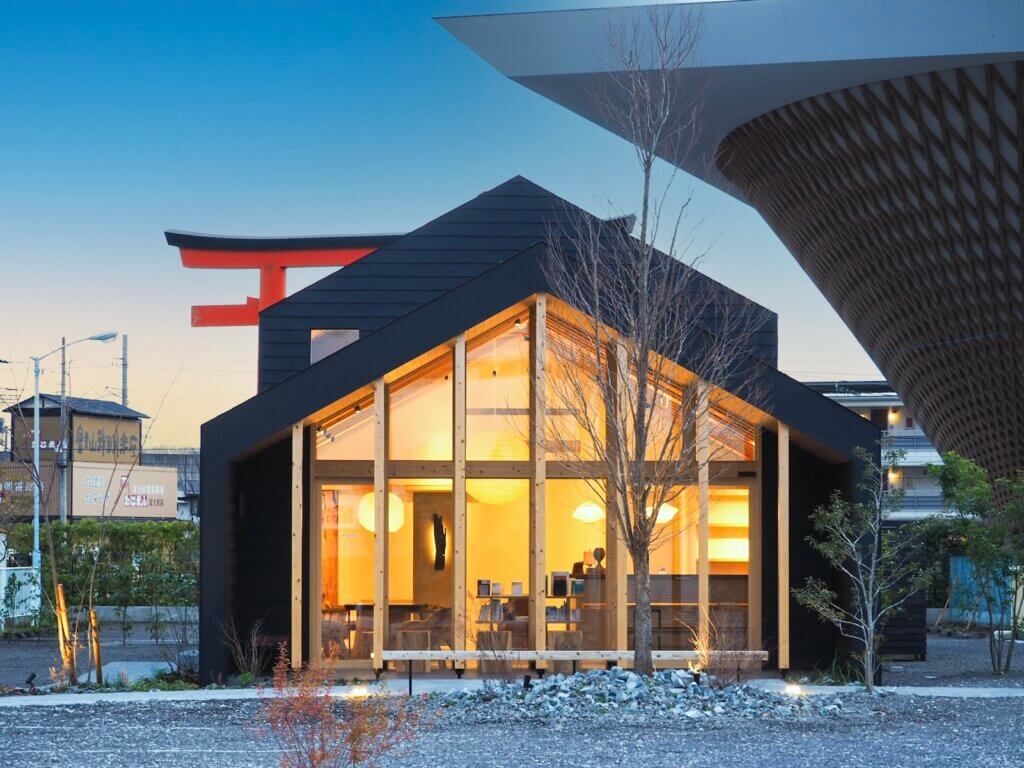 「舎」の字のシルエットが浮かび上がるデザインの外観に、