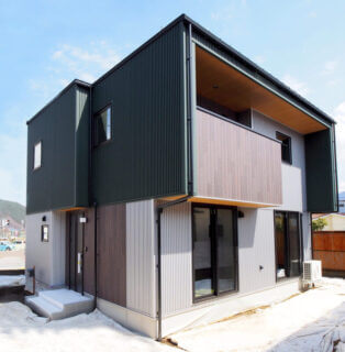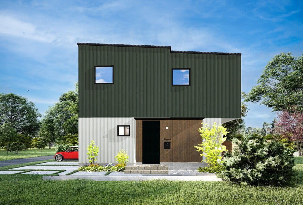 豊かな自然環境に馴染むような、深いモスグリーンのガルバリウムと木目調のサイディングの外観。