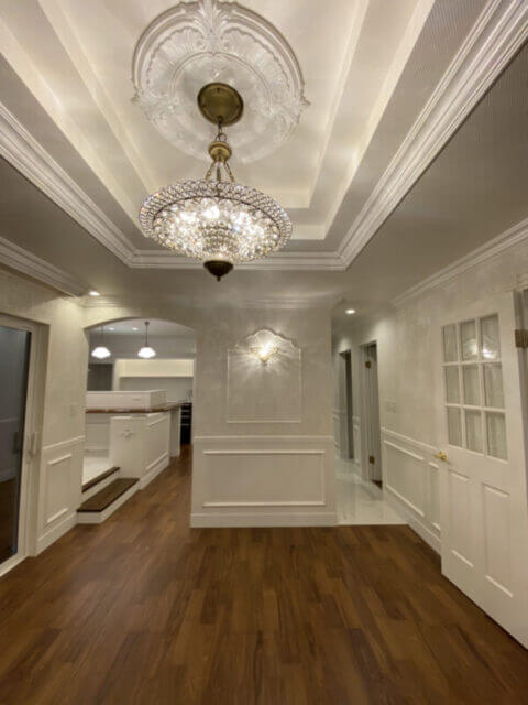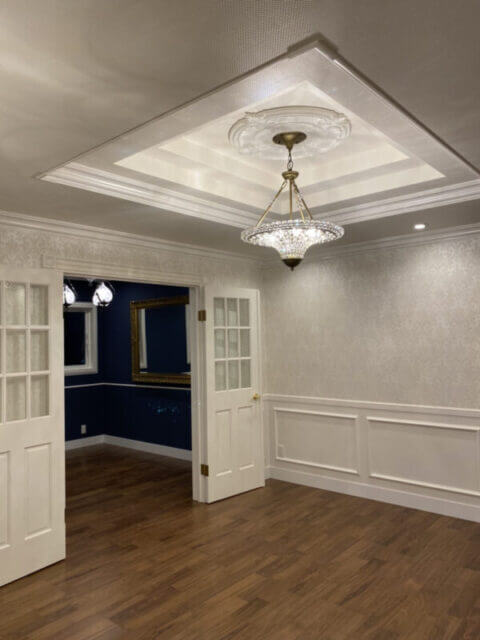 何段にもなる堀上天井には、お部屋の目玉のシャンデリア。