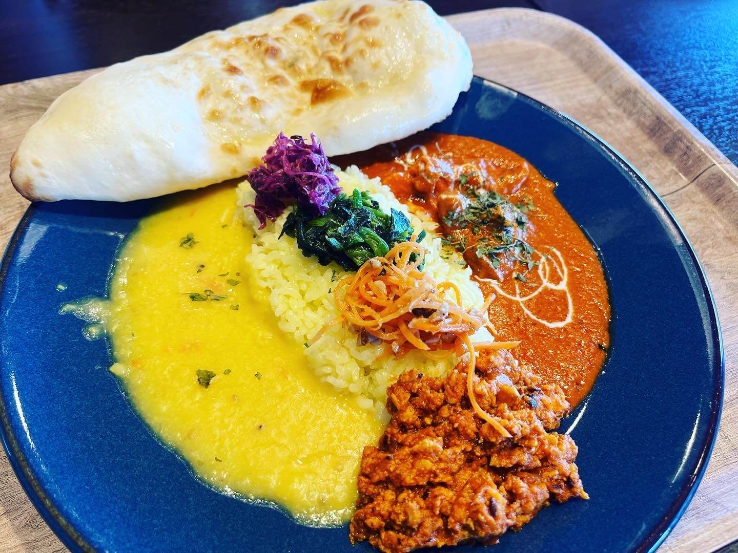 (ドライカレー、バターチキンカレー、豆のカレーとナンが付いたお得なセットです。)