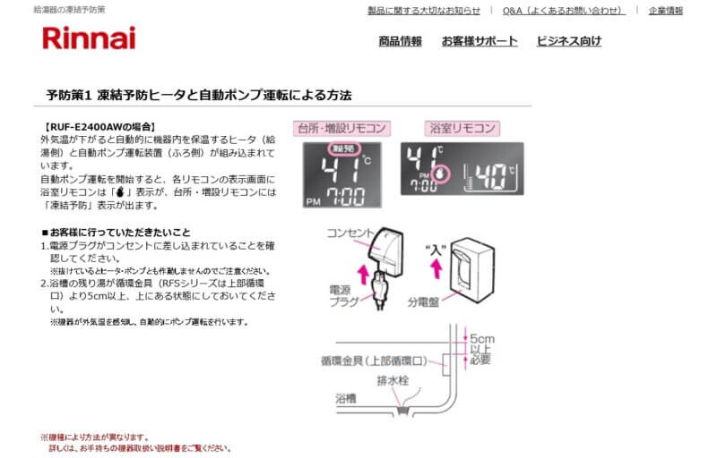 冷え込みが予想される場合は、エコキュート、ガス給湯器ともにお風呂のお湯を残したままにして、