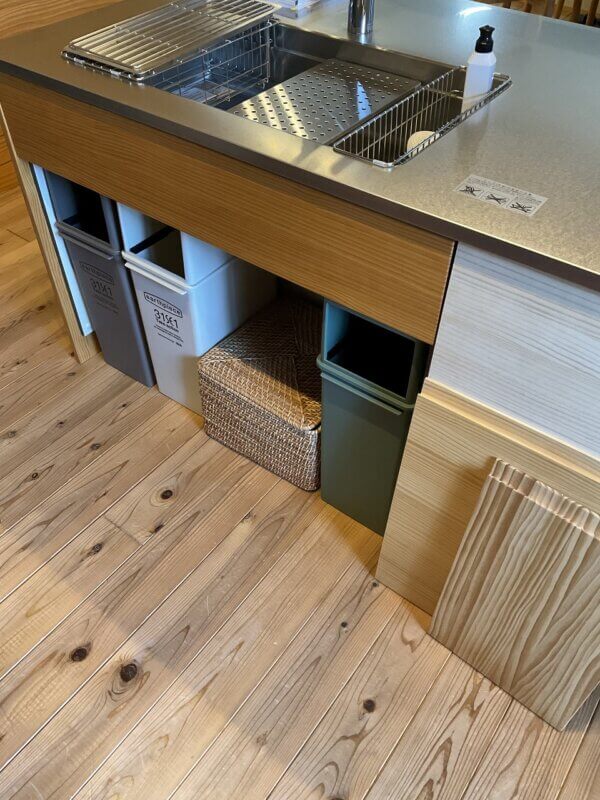 (お料理中にごみを入れやすい場所に、ウッドワンさんのオリジナルごみ箱がピッタリフィットします!)