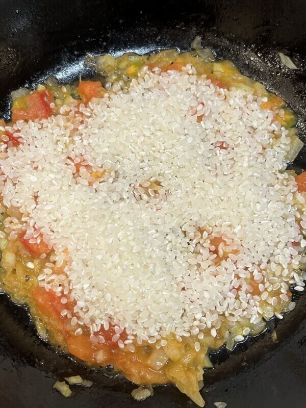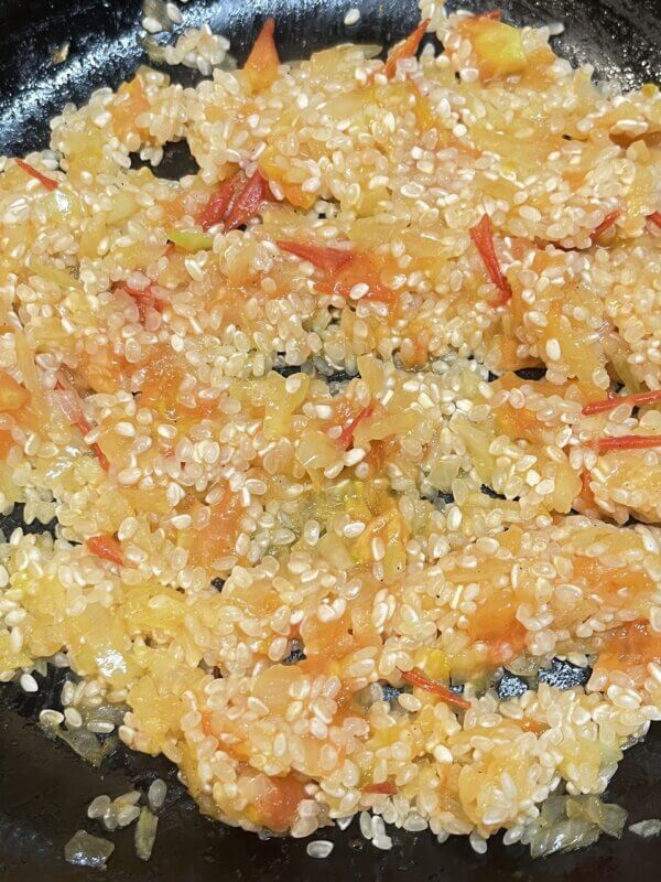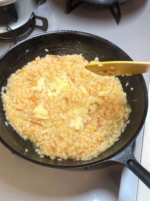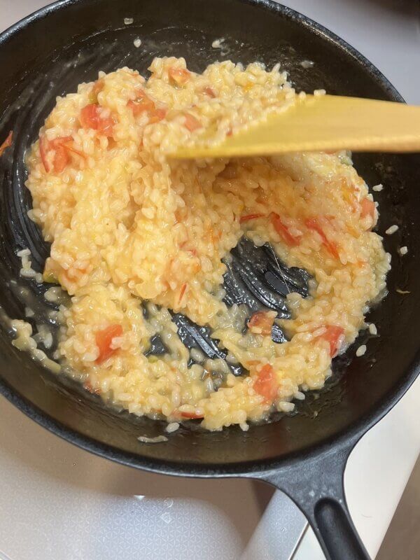 ⑦お米がふっくらと炊き上がってきたら、仕上げのお塩とトマト、チーズを入れて混ぜ合わせます。