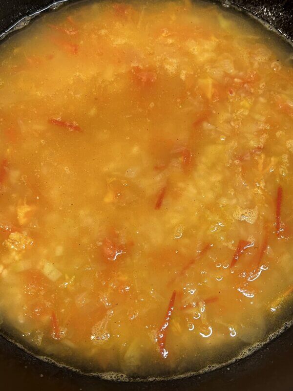 ⑥残りのお水を入れて、蓋をしないで5分煮ます。(フライパンの底が焦げ付かないようにご注意!)