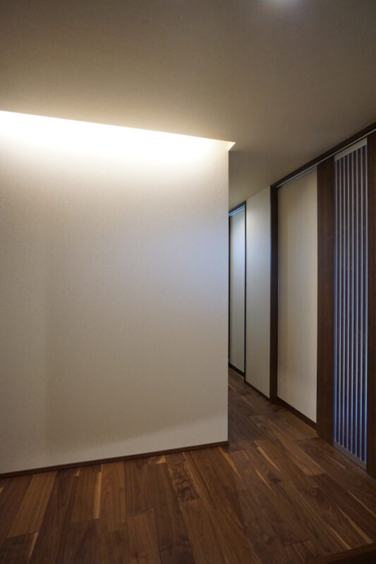 玄関正面の壁面と、リビングのテレビ面の壁の間接照明