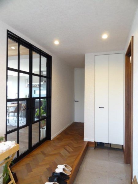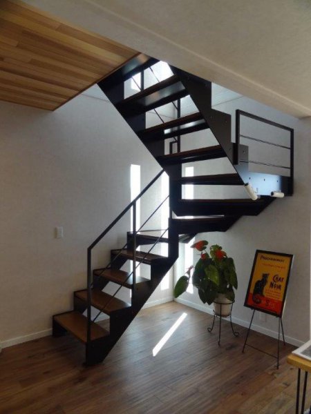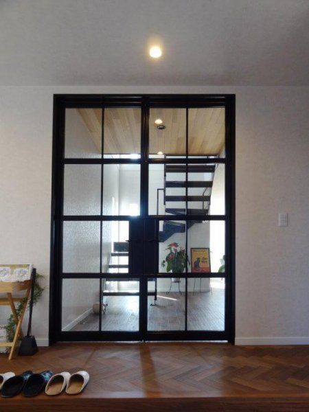 アンティークな雰囲気の両開きアイアンドア・階段もアイアンです。・無垢材・ヘリンボーン床材や