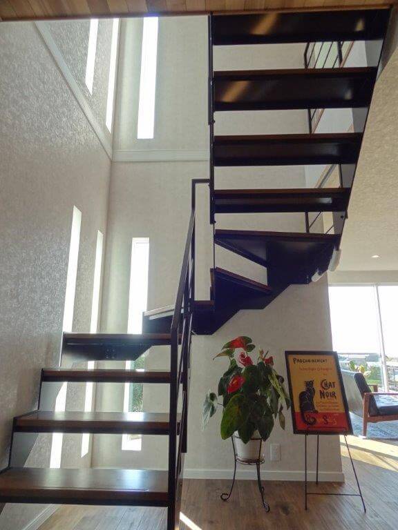 アンティークな雰囲気の両開きアイアンドア・階段もアイアンです。・無垢材・ヘリンボーン床材や