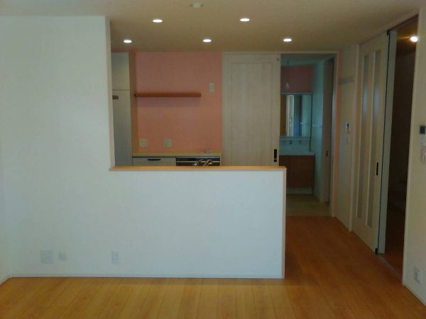 キッチン収納の裏もピンク色のクロスを張りとてもかわいらしく仕上がりました。