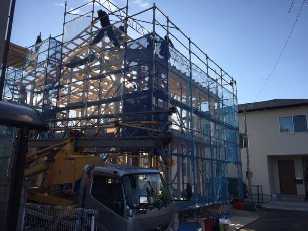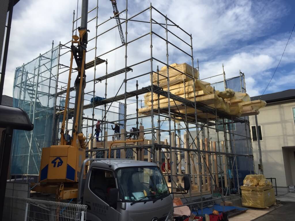 今回は、通常のクレーン車が入る事ができなかったたので、ポターンという電気クレーン車を使用して上棟を行いました。