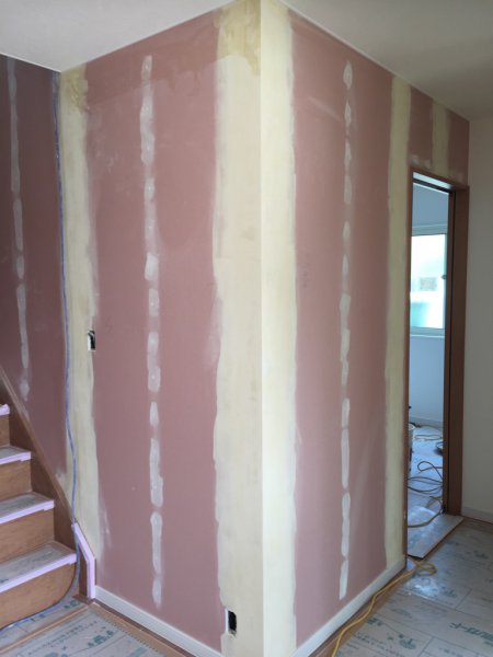 壁紙の施工を行う前には、クロスパテ施工といってプラスターボードとプラスターボードのつなぎ目やプラスターボードを固定しているビス部分の頭の部分を埋める作業を行い、その後にヤスリで平らにしてから壁紙を張り付けていきます!