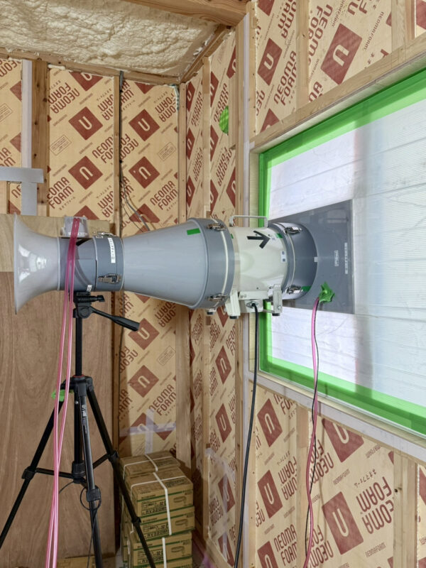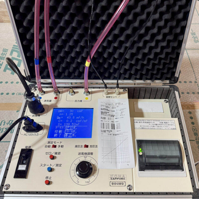 大工さんの工事が進む友人の家。気密性能も大切に現場では1回目の気密測定を実施しました。そう!リビングディーの建物は気密施工だけでなく測定までが標準仕様。しかも!!!工事中と完成時、合計2回の測定を実施しています。ちなみに今回の測定結果は・・・C値:0.2㎠/㎡工事中とは言え、なかなか良い数字。カタログ上、図面上だけでなく実際の工事現場、職人さんの技術力これらすべてが高い品質で保たれています。友人よ、リビングディーで良かったね。 沼津支店 大石