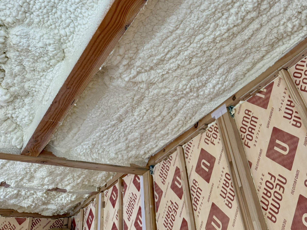 断熱施工が完了した友人の家。ピンクの下地は何だ!?2階に行ってみると天井がモコモコ。吹付タイプの屋根断熱と呼ばれるもので、屋根に沿って隙間なくモコモコモコ。 夏の日差し・冬の冷気を直接受け止める屋根。それ屋根から屋根裏、屋根裏から2階へ。天井裏より高い位置の屋根下で断熱を取ることで居住空間への影響は最小限。よく聞く「2階が暑い」「ロフトが暑い」なんて問題もまるっと解消してくれます。 じゃあ屋根が受け止めた熱はどこへ?屋根と断熱材の間には通気層が設けられています。暑くなった空気は屋根に沿って棟まで登りそのまま外へ排出される。自然の摂理と断熱技術が組み合わさった断熱工法です。 隙間なく施工できるので気密性も高くなりなおのこと快適な居住空間が作れます。これもまたリビングディーの標準仕様。 沼津支店 大石