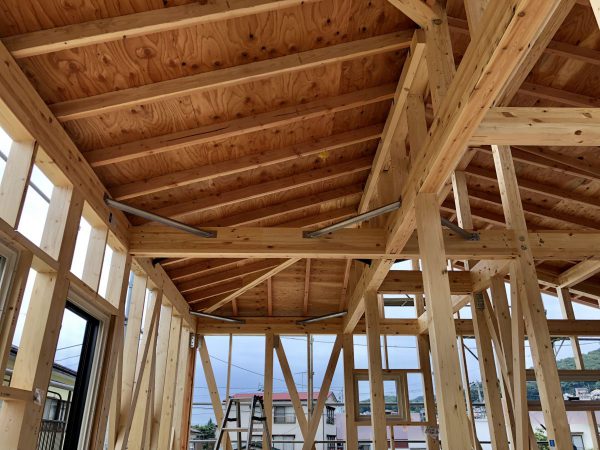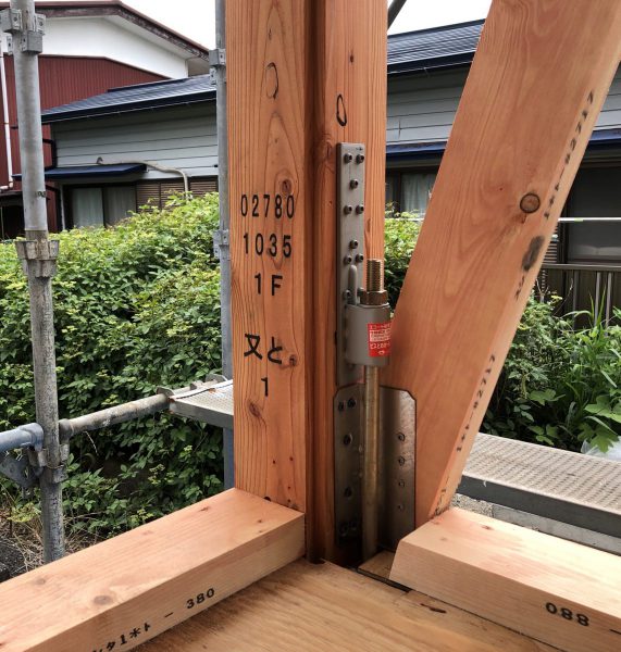 今回は建物の構造の一部をご紹介。 上棟前、基礎から伸びていた金属の支柱がありました▼ 上棟すると、柱と支柱が繋がります▼ ホールダウン金物といい、基礎と柱を繋ぐ重要な金物。 縦揺れの地震など、抜きの力に耐えるために使われています。 2階に上がり、天井を見てみると角を斜めに支える金物が▼ こちらは火打ち梁といい、建物が水平方向に歪むのを防ぎます。 木材を使う場合もありますが、第一建設では金物を使用しています。 一軒のお家も細かなところを見ると様々な部材が使われますね! 沼津支店 大石 倭与(おおいし やまと)