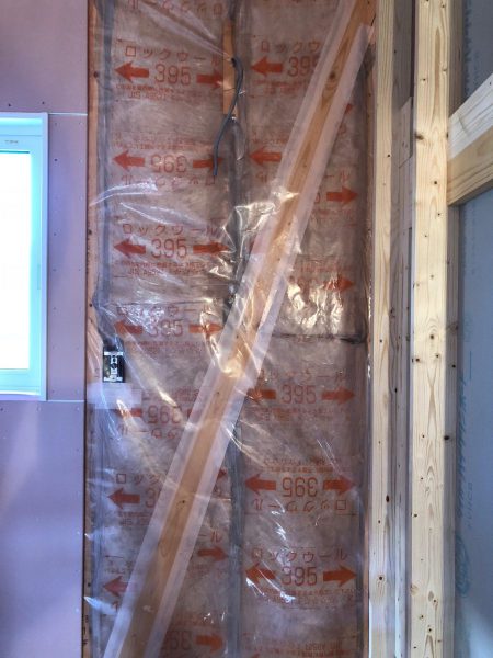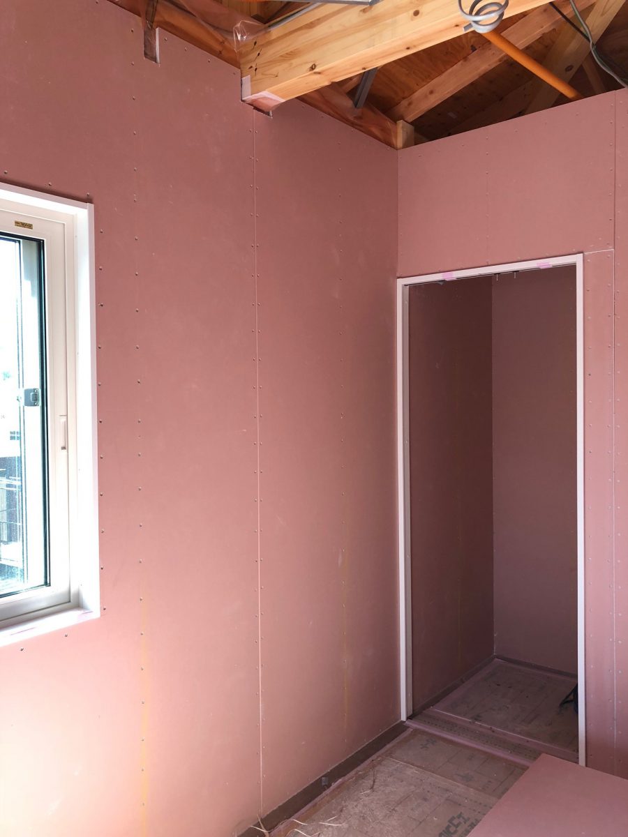 一般的に石膏ボードというと黄色いものですが、第一建設はピンク色。