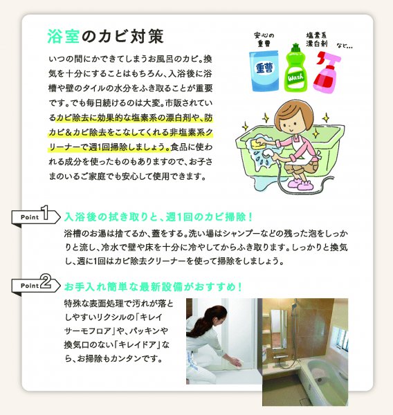 前回に引き続きカビ対策について。前回のカビ対策≫家の中で一番カビが生えやすい場所は?と聞かれて思い浮かぶのは浴室じゃないでしょうか。湿気も多いし、確かにそうかもしれません。でも湿気だけが原因ではありません。カビの大好物は皮脂や石鹸カス。お風呂に入った後は壁をお湯で流す。↓冷水で流す。↓しっかり換気する。これだけでも結構カビの繁殖は抑えられますよ。また、最新のお風呂は汚れやカビのこともよく考えられています。これから家を建てようと思っている方は、住宅設備も要チェック!沼津支店 大石 倭与(おおいし やまと)