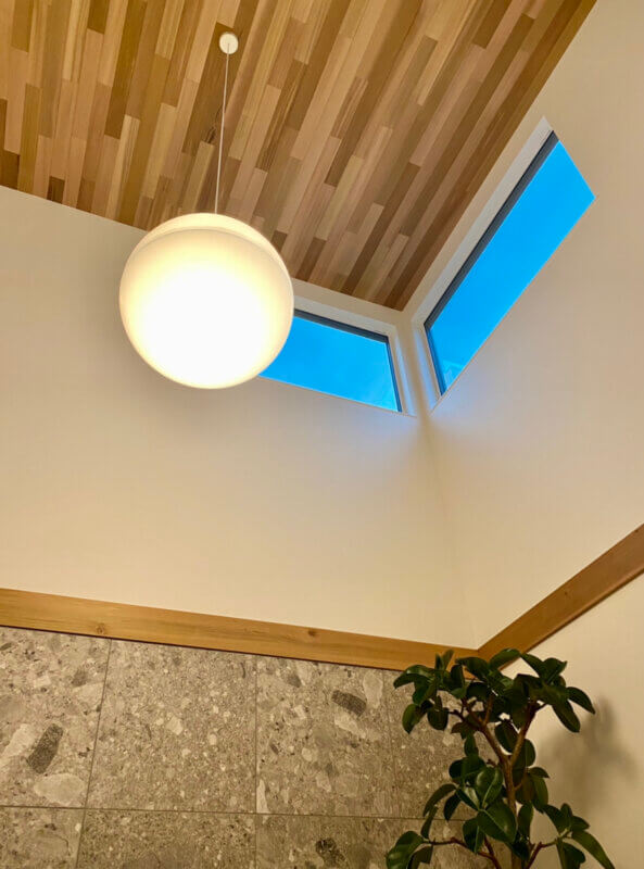 開放的な吹抜けとその先に切り取られた青空。