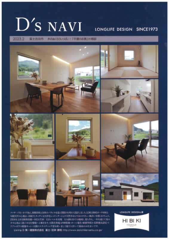 D’s NAVI 2月号のご紹介毎月発行されている施工実例D’sNAVIをご紹介します。 今月は富士吉田市のお住まいお問い合わせでも人気の高い\【平屋】が掲載されています /これからお家を検討される方はもちろん、マイホーム取得後もインテリアや家具の参考になるので、私個人としても毎月発行されるのをとても楽しみにしています♪ご希望の方にはバックナンバー集も差し上げてます。カタログ・パンフtレット資料請求はこちら>> 3/11(土)・12(日)【長泉町】子育て世代と考えた39坪 HEAT20G2の家 完成見学会 >>