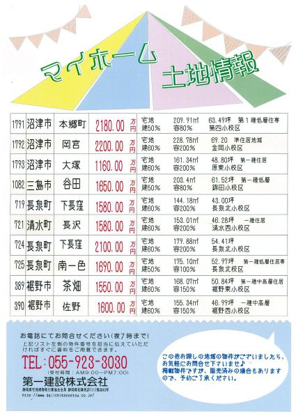こんにちは♪今月も月末に発行しているサエラから第一建設厳選の8月の土地情報をご紹介します。 これから家を建てられる方には、ご希望の土地をスタッフがお探しします。サエラに掲載されている以外にも土地情報あります。お気軽にお問合せ下さいね♪ 第一建設では大型台風接近に備え、緊急体制を整えております。↓オーナーのみなさまへ『台風12号の接近通過可能性に伴う、弊社対策及び連絡先』※オーナー様以外でも災害の被害に合われ、対応先が無くお困り方もお気軽にご連絡ください。 沼津支店 松下『Culas+』のご予約お声掛けくださいInstagram・FacebookでCaféLDKの情報発信中!沼津isai Facebookもご覧ください家づくりキャンパス予約はコチラから