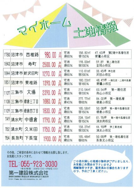 こんにちは♪今月も月末に発行しているサエラから第一建設厳選の5月の土地情報をご紹介します。 これから家を建てられる方には、ご希望の土地をスタッフがお探しします。サエラに掲載されている以外にも土地情報あります。お気軽にお問合せ下さいね♪ 沼津支店 松下