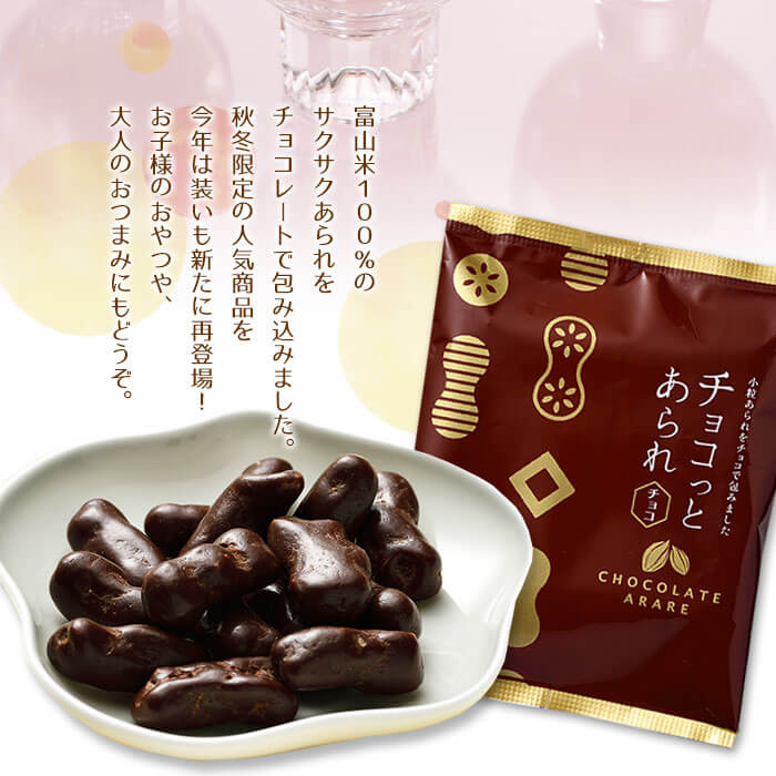 富山米100%の小粒あられをチョコレートで包んだ秋冬限定のあられです。