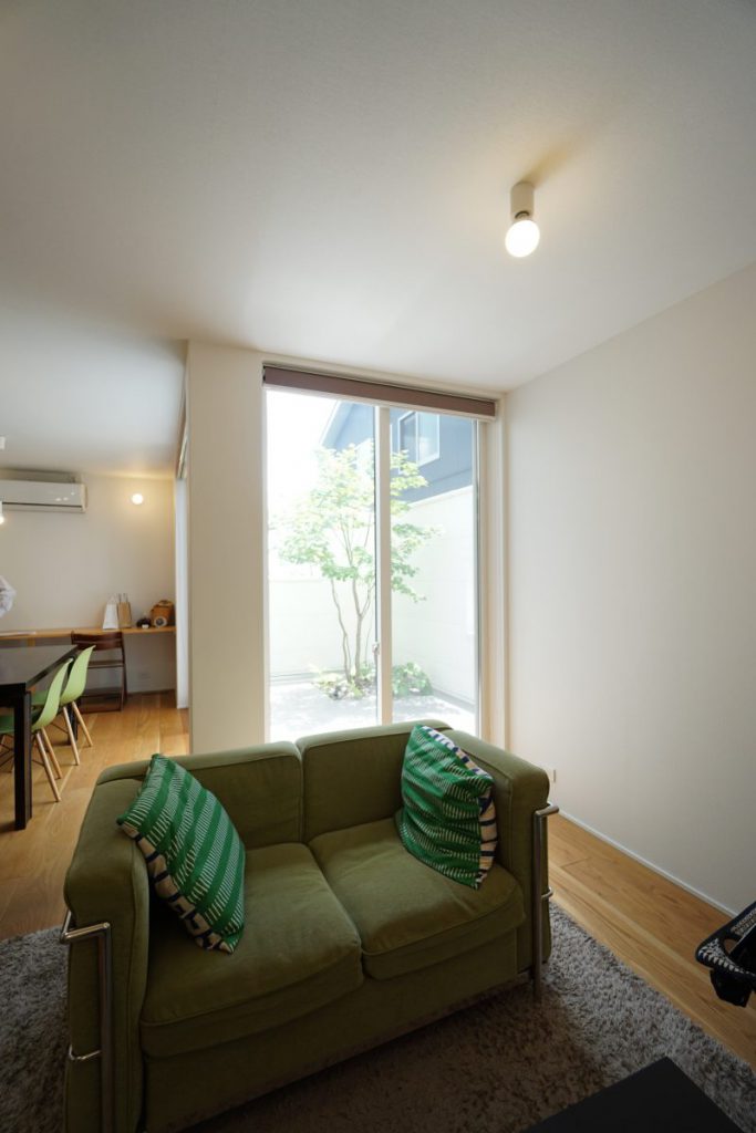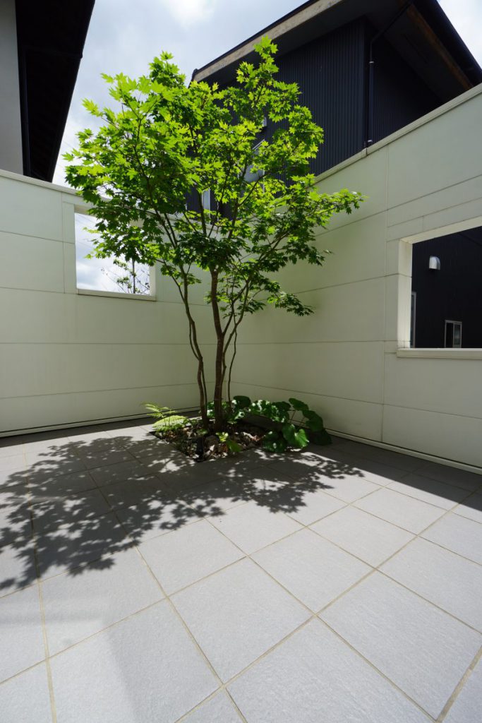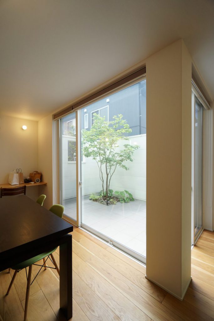 ▲夏も冬も十分に光を取り入れられるよう、位置にこだわったテラス庭。視界をコントロールする壁をテラスの外側に設置することで、プライベート感を演出しています。内外の床の境界をフラットに仕上げ、続き間のような開放感をもたらしています。