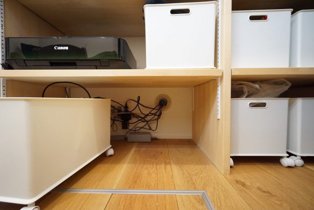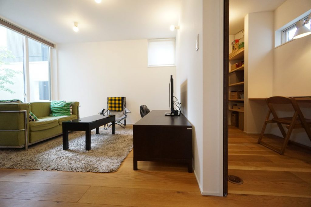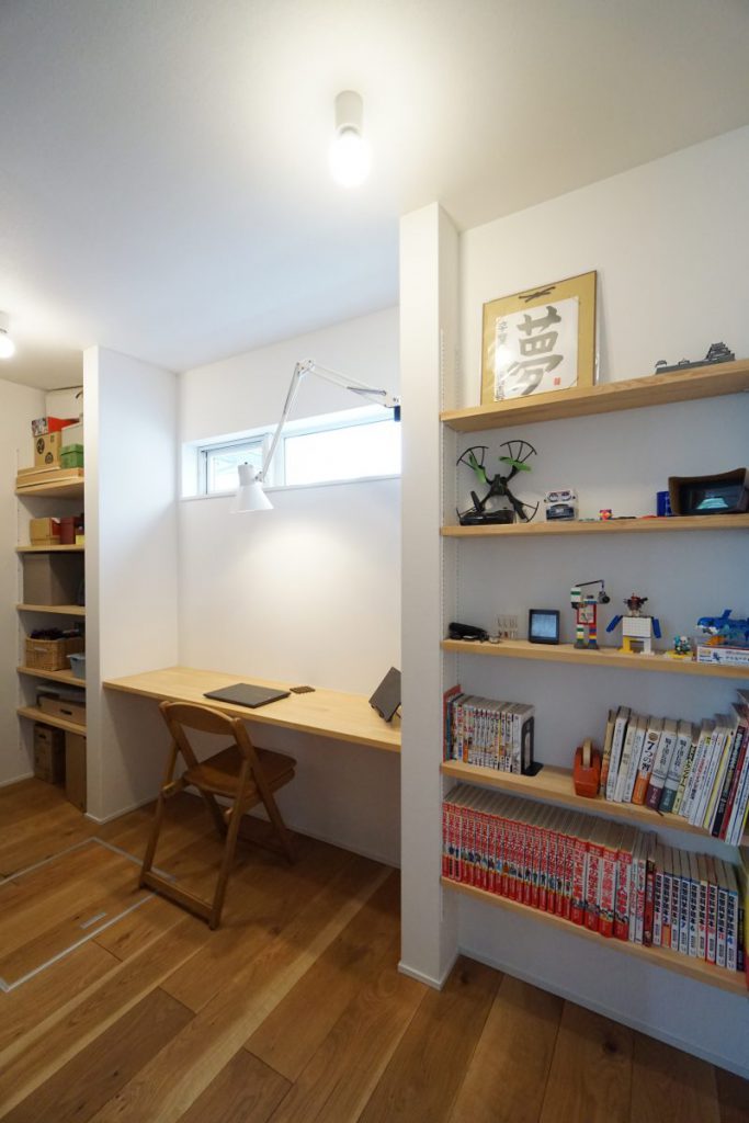 ▲秘密はテレビ裏の書斎。配線類は壁穴を通してすべてまとめています。この他書斎には住宅の機械設備(HEMS等)や生活感が表れてしまいがちな小物を収納できる大容量の棚を設置し、隠す収納として大活躍!