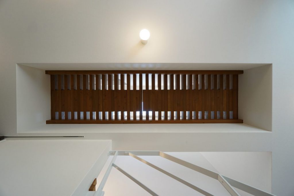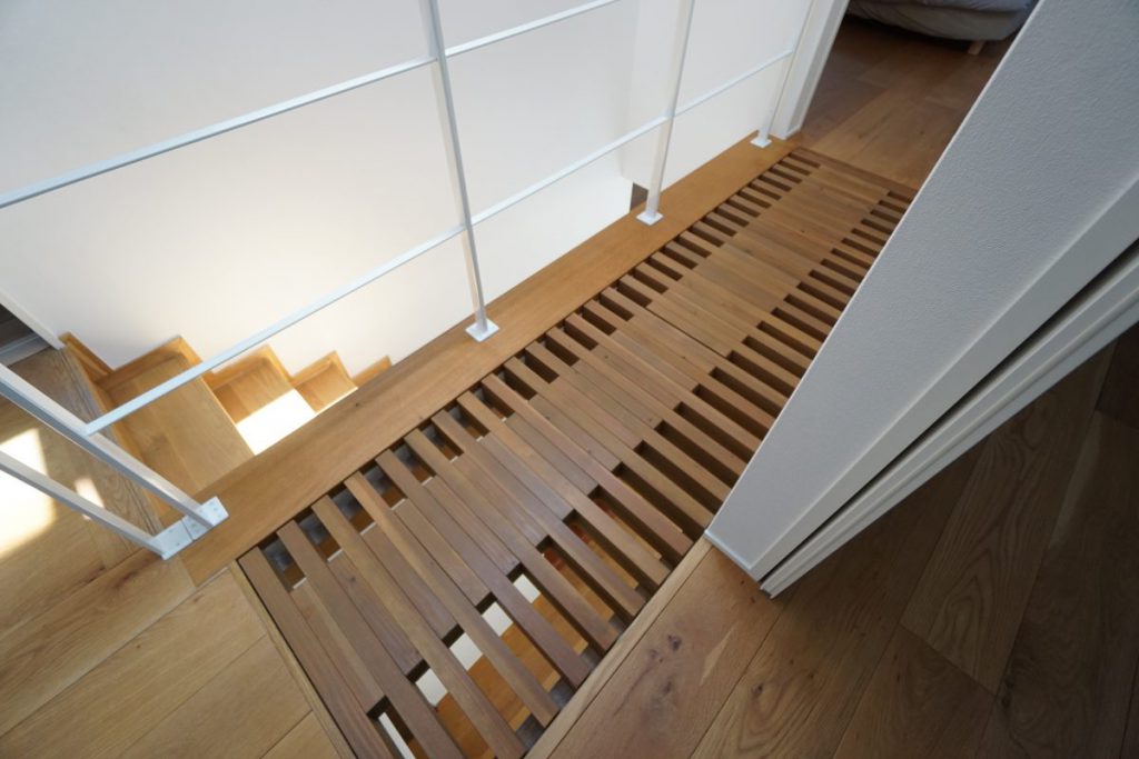 ▲階段横の廊下は、ご主人のご要望ですのこ床のキャットウォークに。天窓からの採光と風通しにも一役買っています。