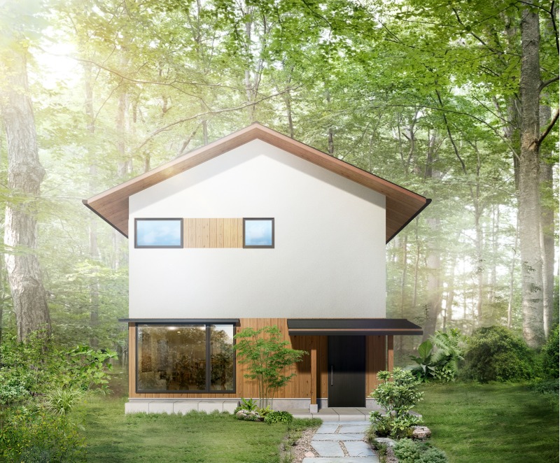 4 寸勾配の切妻屋根の外観。外壁に塗り壁と天然木を使用し、自然に溶け込む家。