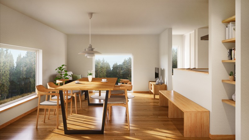 窮屈さを感じさせない南北に通ったLDK.風や視線の通りがよく、一体感のある空間に。