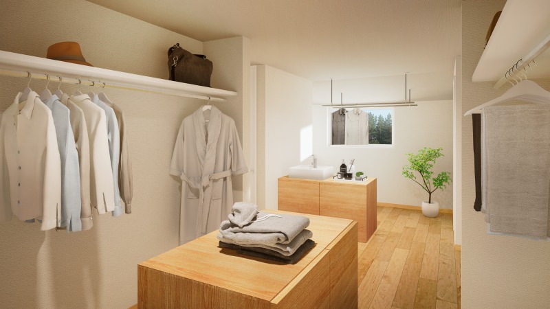 浴室と脱衣室を設計。開放的なホールを設け、洗面台を挟んでランドリーコーナーとドレスルームを設けることで洗濯動線を2階で完結させる。空間を贅沢に使用した家事ラクホールが誕生。