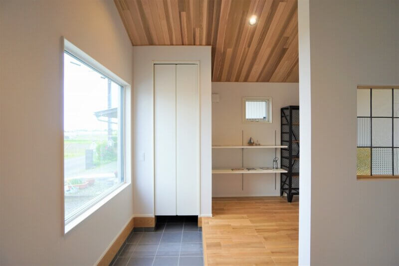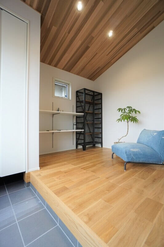 玄関土間の先にあるご主人の趣味室は、室内でもアウトドア気分を楽しめる『窓』の或る空間