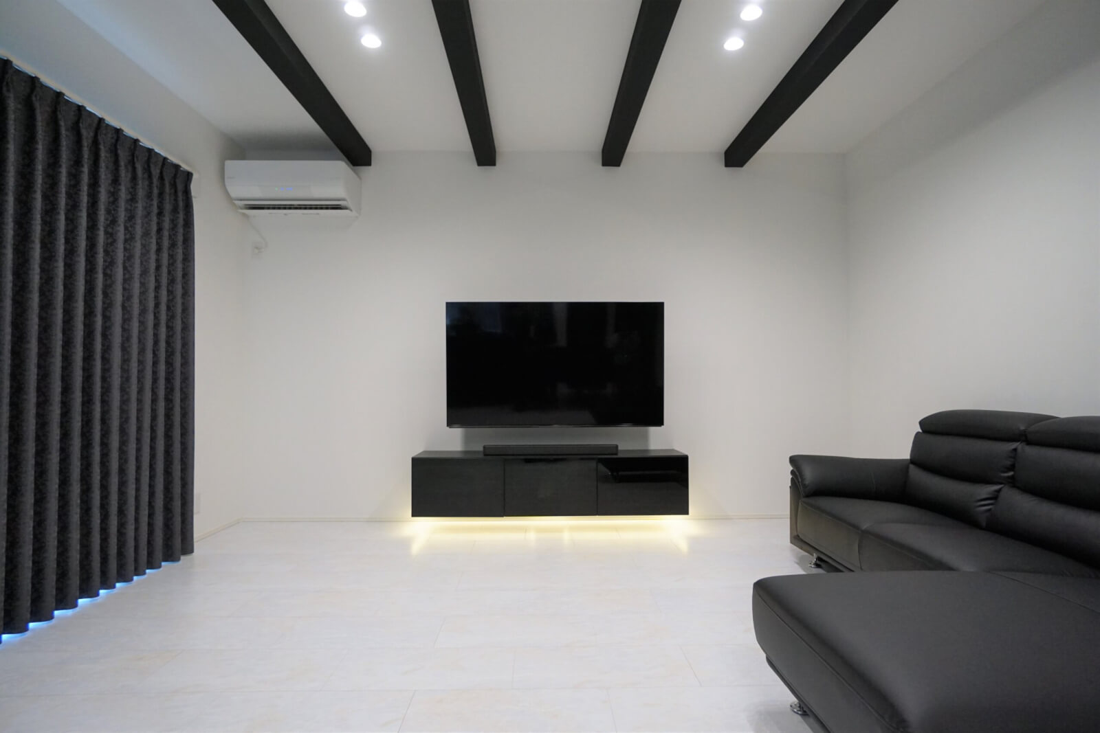 フロートタイプのテレビボードの下には、DIYで取り付けられた『間接照明』