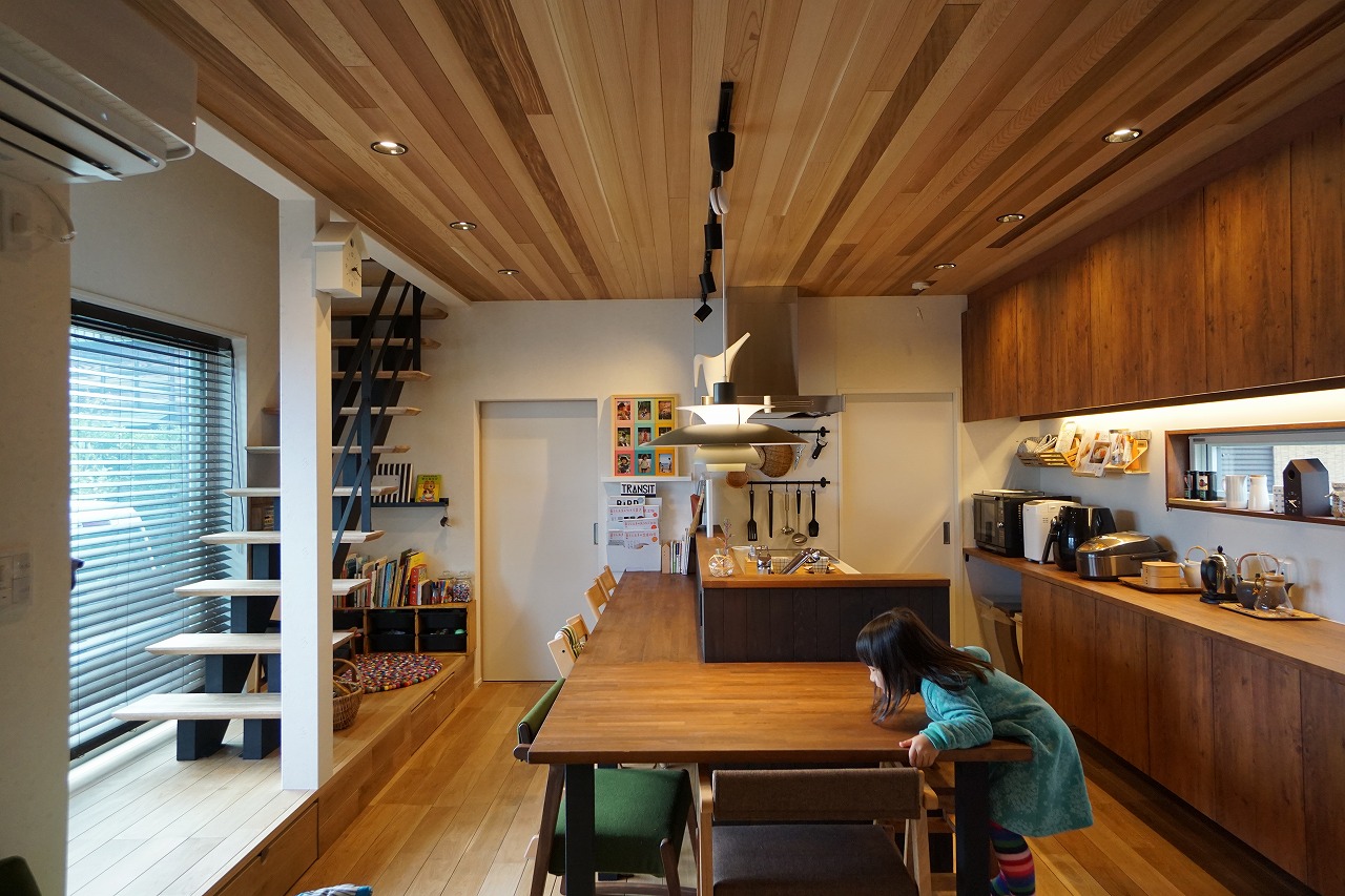 サーフボードが飾れる吹抜と、キッチンまわりのOSB、単行本のたくさん入る本棚、との