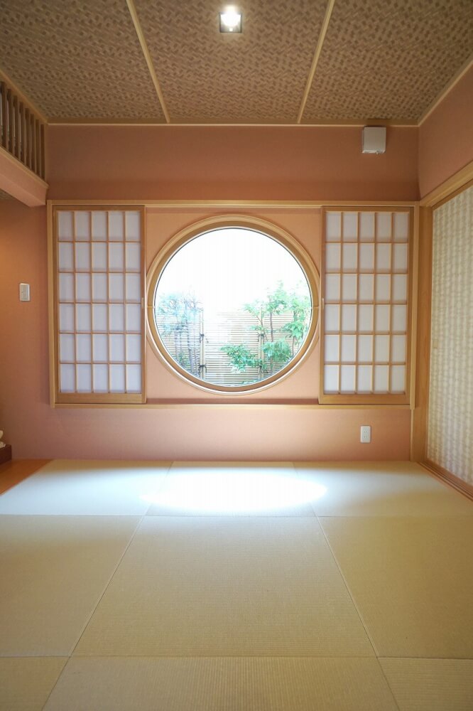 和室の『丸窓』から眺める『坪庭』の木々