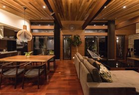 間接照明がレッドシダーの天井に返りやわらかな光が降りてくるLDK