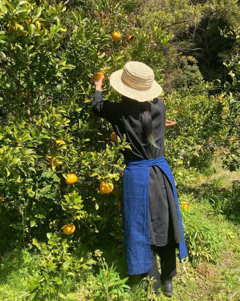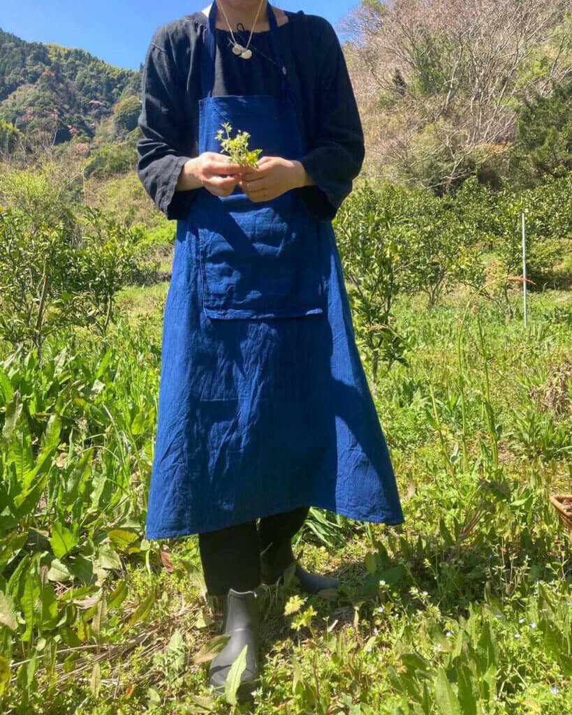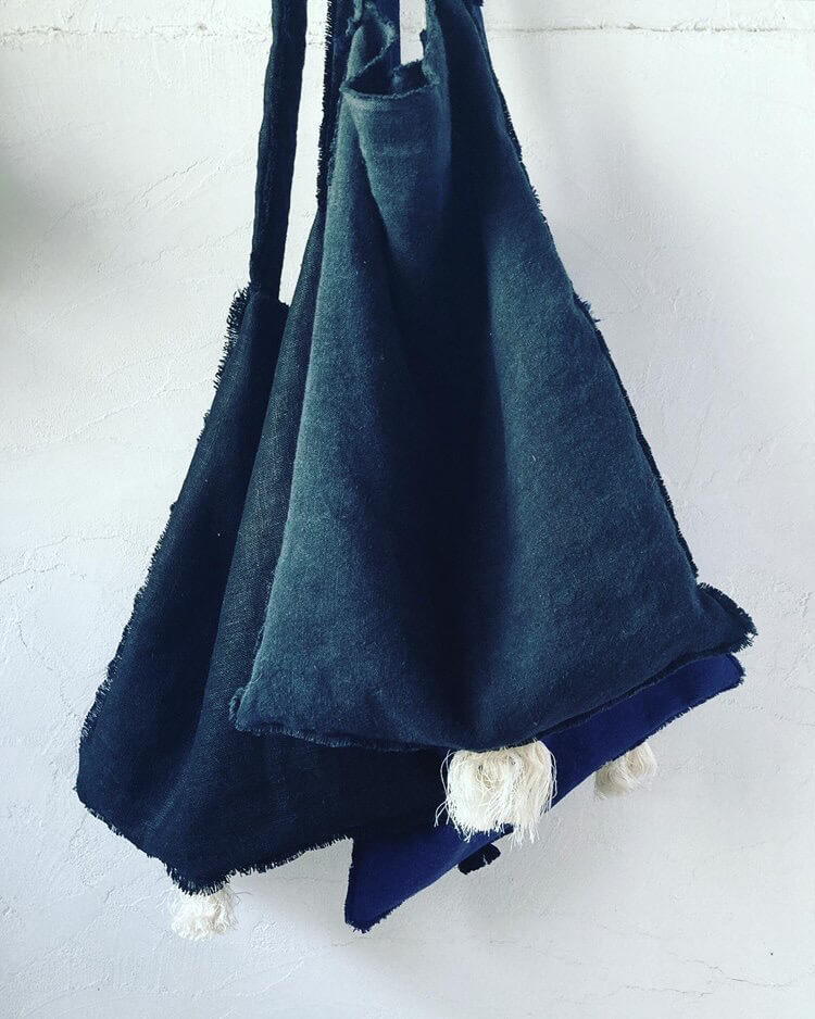 黄月さんは、植物染の藍生地、日本やヨーロッパのリネン(麻)、