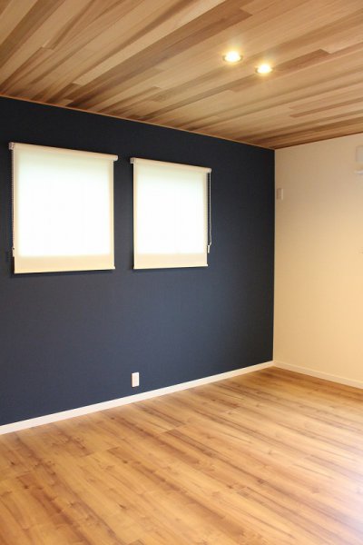 寝室にネイビーのクロスとレッドシダーの天井。