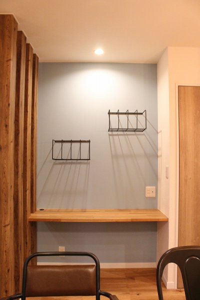 ダイニングのカウンター部分に、ブルーグレーのアクセントクロス。